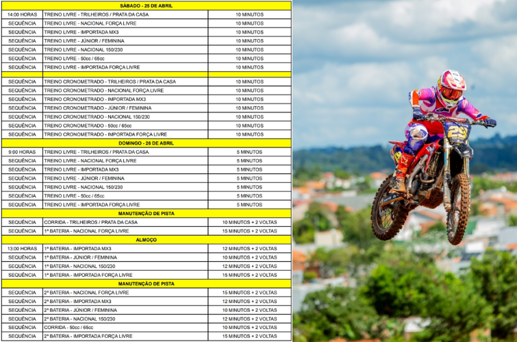 A competição contará com as seguintes categorias; Trilheiros/Prata da Casa, Nacional Força Livre, Importada MX3, Júnior/Feminina, Nacional 150/230, 50cc/65cc e Importada Força Livre.