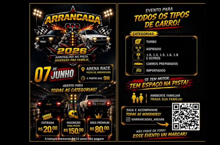 Os apaixonados por velocidade já têm encontro marcado no dia 7 de junho com o Arrancadão 2026, evento que promete movimentar Rio Branco com muita adrenalina e competição na pista.