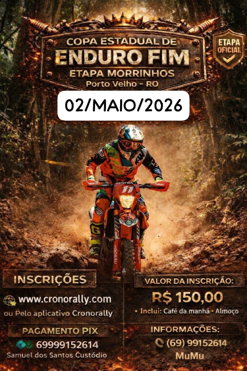 A cidade de Porto Velho recebe neste sábado (02) a etapa Morrinhos da Copa Estadual de Enduro FIM, reunindo pilotos de diferentes níveis em um circuito preparado para competição e também para quem está iniciando na modalidade.