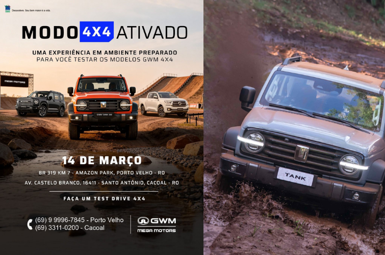 A concessionária GWM Mega Motors realiza amanhã, sábado (14 de março), um evento especial voltado para quem gosta de aventura, tecnologia e veículos 4x4. A programação acontece das 8h30 às 15h em Porto Velho e Cacoal, com pistas off-road preparadas para testar o desempenho dos modelos da marca.