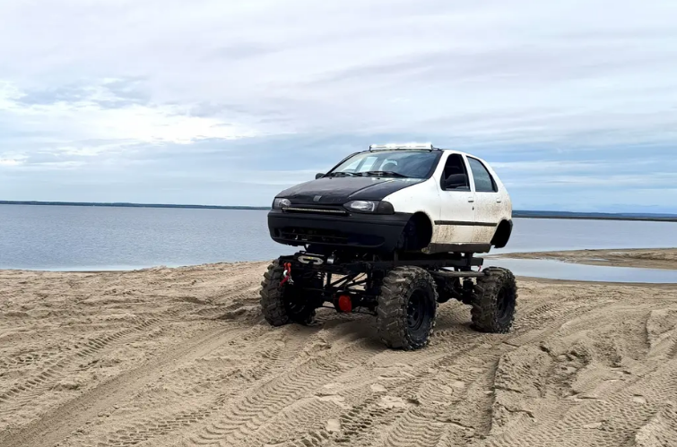 Quem passou algum tempo nas redes sociais nas últimas semanas provavelmente se deparou com uma cena inusitada: um Fiat Palio rodando sobre um chassi elevado, com pneus gigantes, encarando trilhas e até passando pela areia da praia. Apesar da aparência fora do comum, o projeto não é fruto de inteligência artificial, mas sim de criatividade, necessidade e muito trabalho manual.