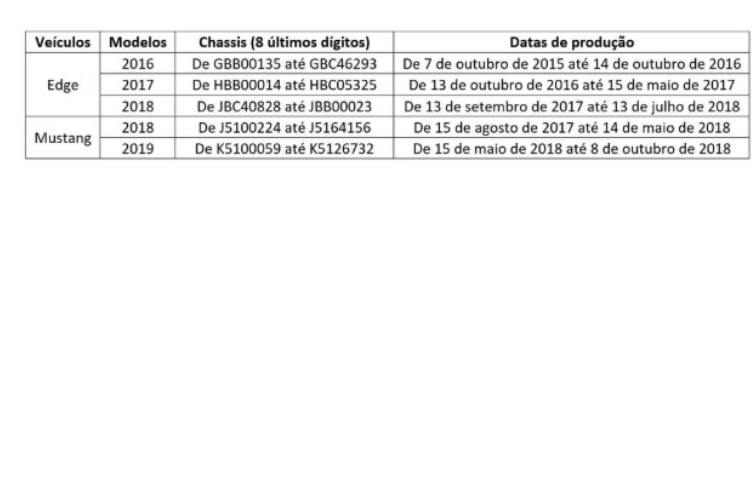 A Ford Motor Company Brasil Ltda. dá continuidade à Campanha de Recall publicada em 14 de outubro de 2025, e convoca os consumidores proprietários dos veículos Ford Edge, modelos 2016 a 2018, e Ford Mustang, modelos 2018 e 2019, com numeração de chassi e datas de produção abaixo relacionadas, para agendarem a realização gratuita do serviço previsto na presente Campanha: