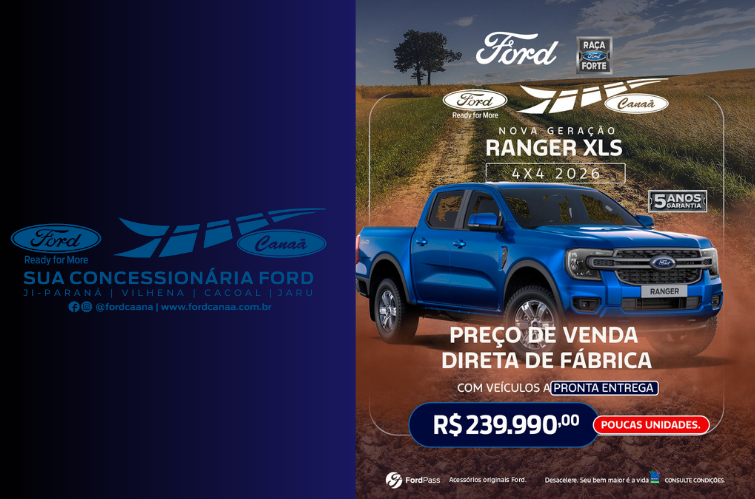 A Ford Canaã anunciou a chegada da Nova Geração da Ranger XLS 2.0 4x4 cabine dupla, modelo 2026, com condições especiais para venda direta de fábrica e entrega imediata. A picape chega ao público com preço de R$ 239.990 e estoque limitado.