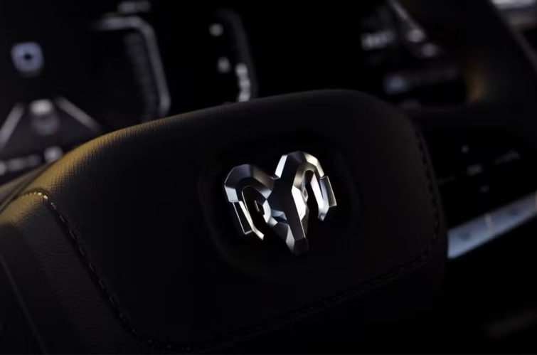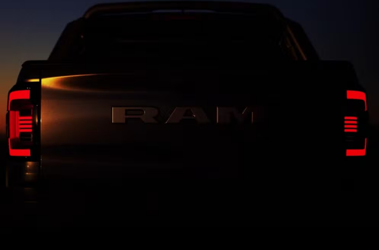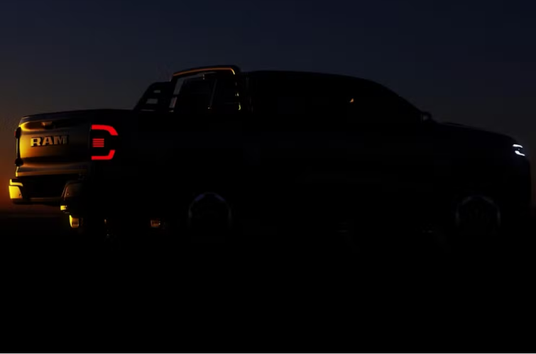 Até então, apenas o conceito Nightfall havia sido apresentado. Agora, as fotos revelam a versão de produção com visual inspirado no protótipo, mas com linhas próprias. A dianteira exibe faróis estreitos com duplas faixas de LED, grade robusta e a tradicional assinatura Ram. Na traseira, novas lanternas e o nome da marca em alto relevo reforçam a identidade da caminhonete.