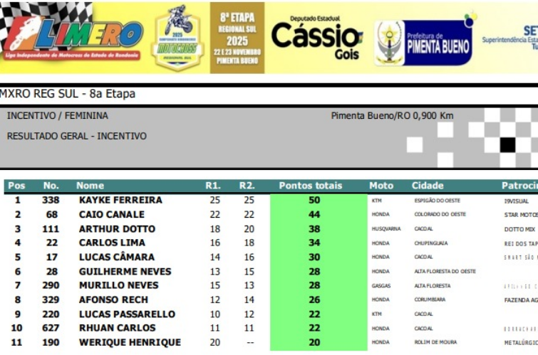 Abaixo, você confere todos os resultados por categoria da final do Regional Sul de Motocross.