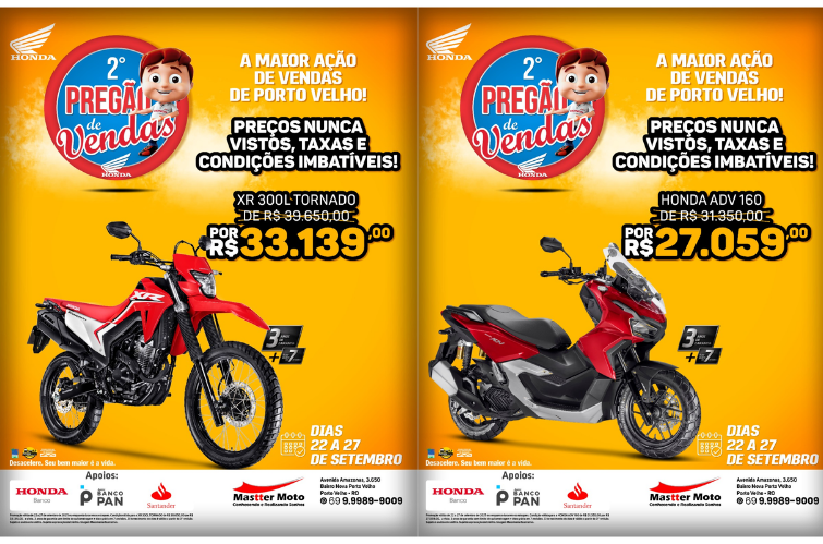 A Mastter Moto está promovendo o 2º Pregão de Vendas, considerado a maior ação de vendas de motocicletas de Porto Velho. O evento acontece de 22 a 27 de setembro, trazendo condições inéditas, com preços de fábrica, taxas especiais e facilidades exclusivas de financiamento e consórcio.