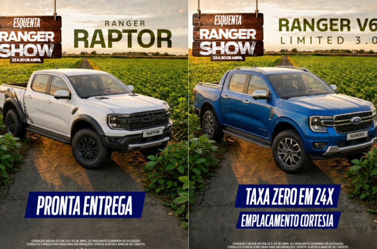 A Mega Ford deu início à campanha “Esquenta Ranger Show”, com ofertas especiais voltadas à linha de picapes da marca. A ação é válida até o dia 30 de abril ou enquanto durarem os estoques.