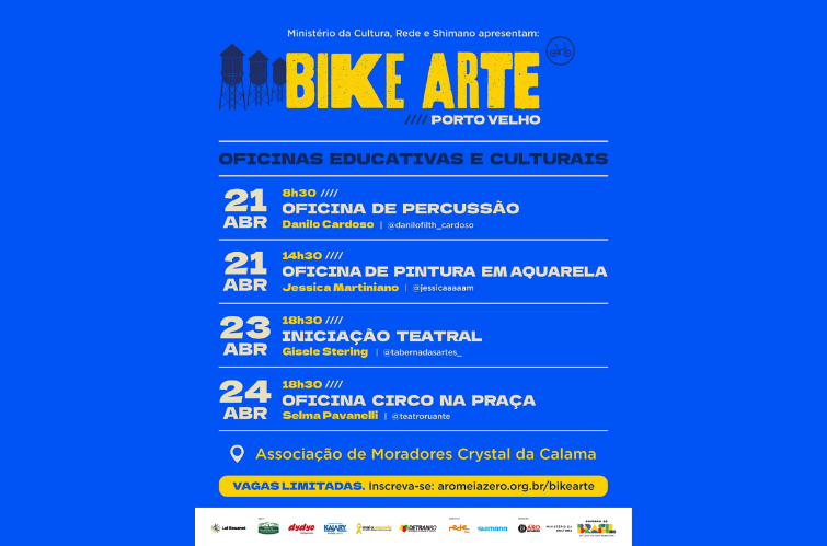 O Festival Bike Arte chega a Porto Velho com uma programação voltada à cultura e educação, oferecendo oficinas gratuitas em diferentes linguagens artísticas. As atividades acontecem entre os dias 21 e 24 de abril, na Associação de Moradores Crystal da Calama.