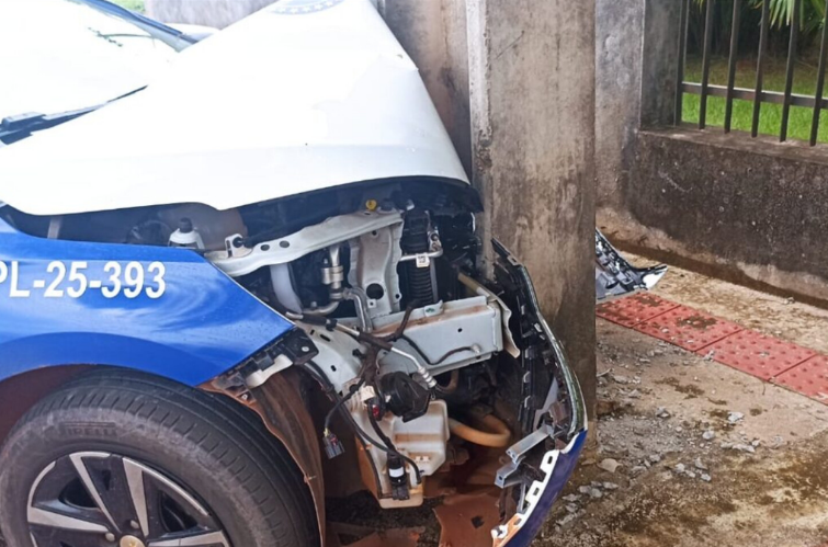 No momento em que a viatura tentou interceptar o motociclista, o motorista perdeu o controle da direção, resultando em uma colisão violenta contra um poste. Com o impacto, a parte frontal do veículo ficou completamente destruída.
