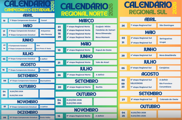 Já o Regional Norte terá início em março, com provas programadas em Guajará-Mirim, Candeias do Jamari, Nova Dimensão e Nova Mamoré. A competição segue ao longo do ano com etapas em Itapuã do Oeste, Vale do Anari e Buritis.