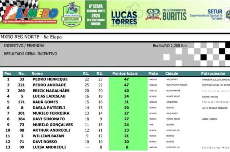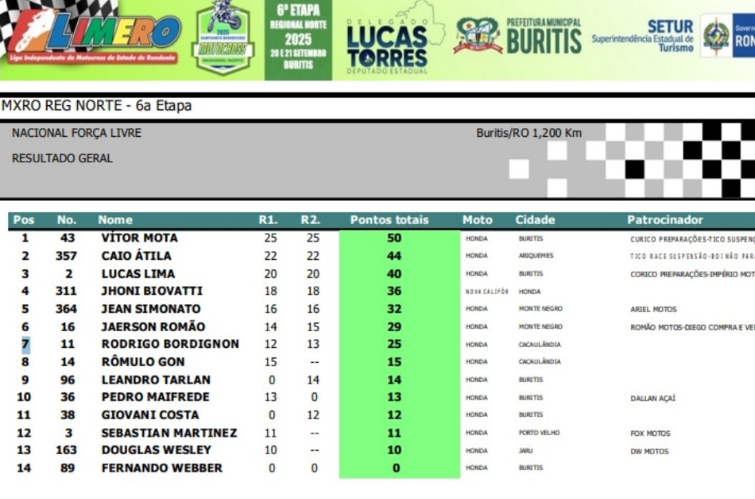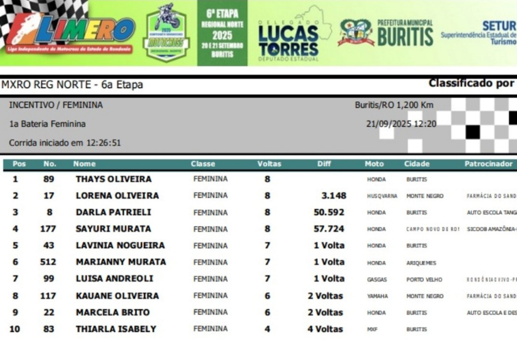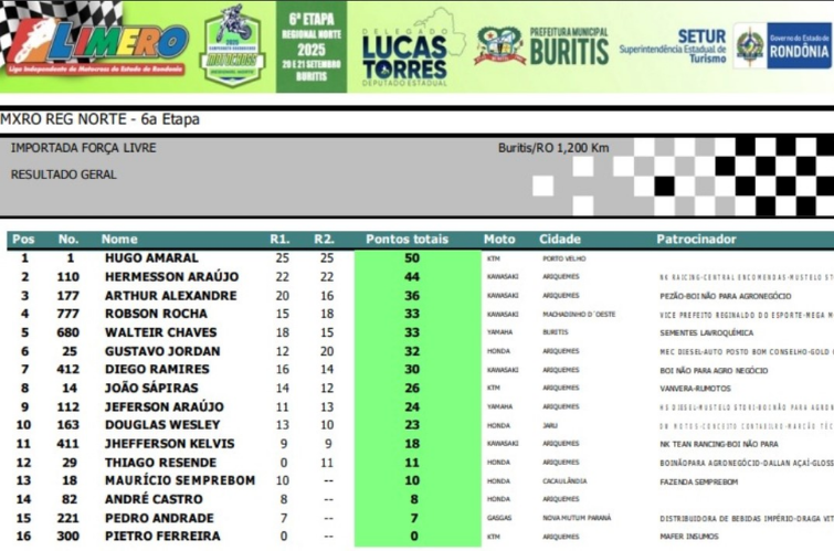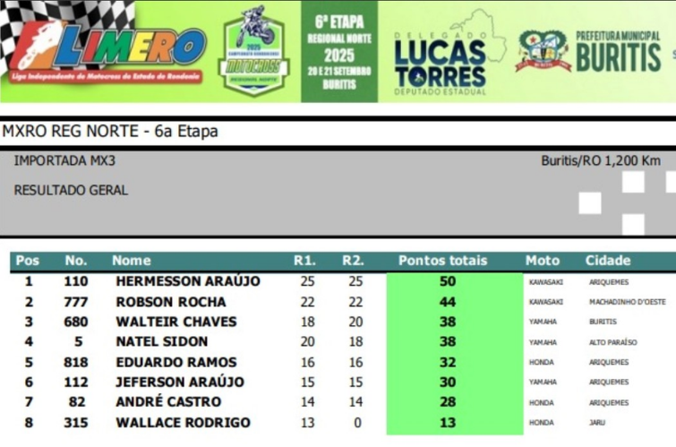 O município de Buritis foi palco da 6ª etapa do Regional Norte de Motocross 2025, realizada no último final de semana, dias 20 e 21 de setembro, no tradicional circuito Pé de Galinha. O evento reuniu os melhores pilotos do estado e da região Norte do país.