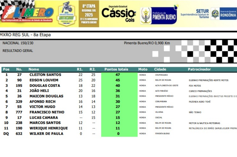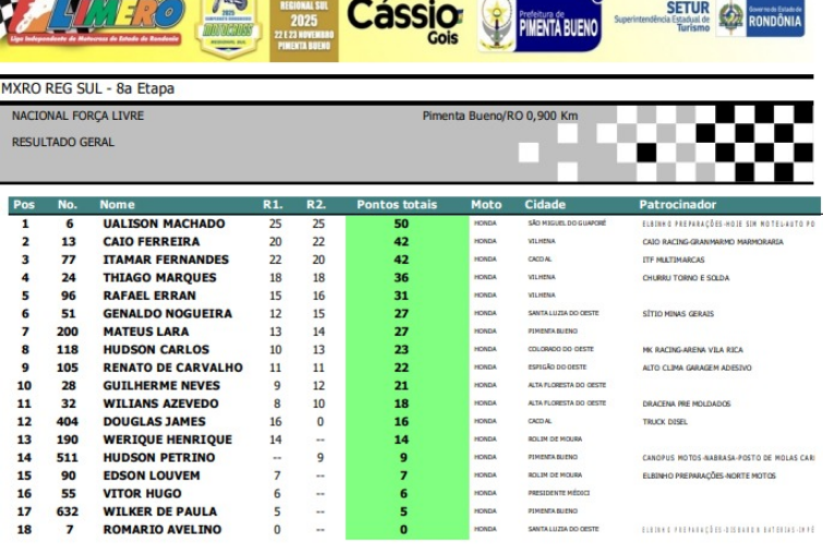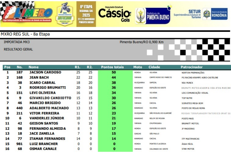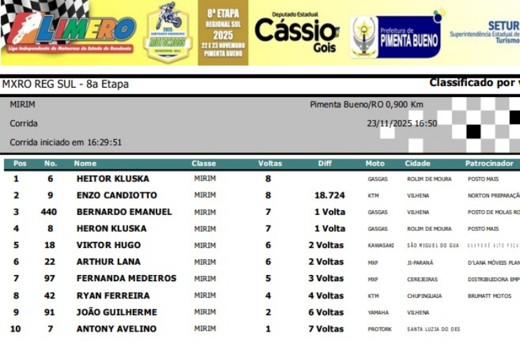 Abaixo, você confere todos os resultados por categoria da final do Regional Sul de Motocross.