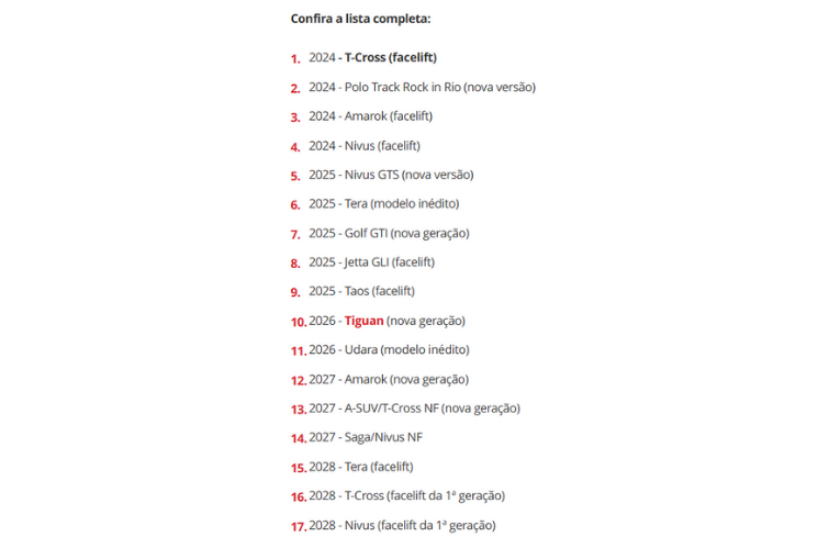 2028 – Tera (facelift), T-Cross (facelift da 1ª geração), Nivus (facelift da 1ª geração)